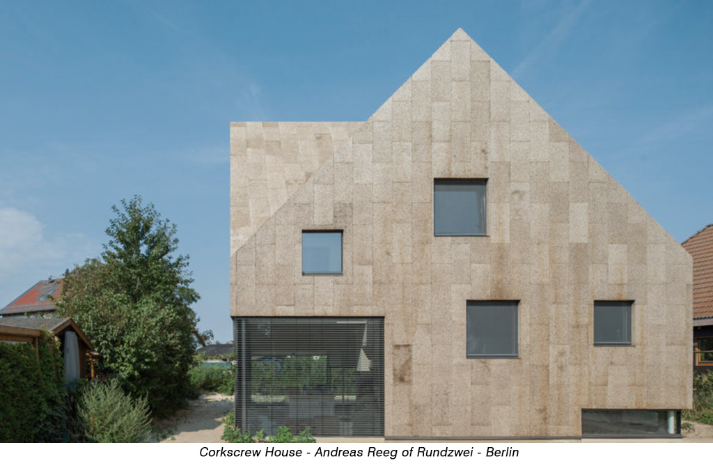 Du fait de ses caractéristiques (isolant, imputrescible, étanche, agréable au toucher…) il n’est pas surprenant de voir ce matériau naturellement décliné en parement , intérieur comme extérieur. Le matériau quittant l’ombre des entrailles des bâtiments pour être révélé et magnifié au grand jour. Un des projets les plus connus est sans nul doute le pavillon de la Serpentine Gallery, rêvé et dessiné par Herzog & de Meuron et Ai Weiwei, dont le sol, les gradins, le mobilier, l’habillage des poteaux… tout est intégralement fait de liège. Bien d’autres projets ont su mettre en avant ce noble matériau, comme illusté ici.